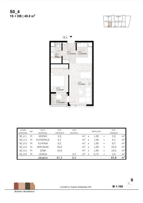 Stan S 0_4 nalazi se u prizemlju površine 49,80 m2, a sastoji se od hodnika, kupaonice, kuhinje, boravka s blagavaonicom, spavaće sobe i loggie.