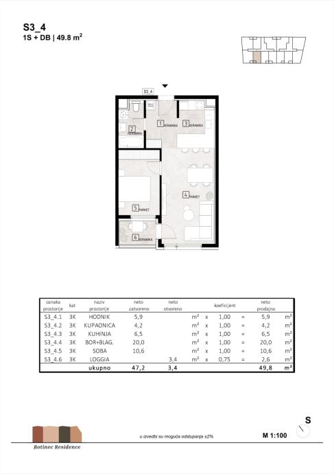 Stan S 3_4 nalazi se na trećem katu površine 49,80 m2, a sastoji se od hodnika, kupaonice, kuhinje, boravka s blagavaonicom, spavaće sobe i loggie.