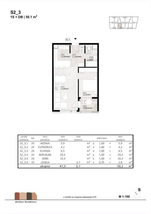 Stan S 2_3 nalazi se na drugom katu površine 50,10 m2, a sastoji se od hodnika, kupaonice, kuhinje, boravka s blagavaonicom, spavaće sobe i loggie.