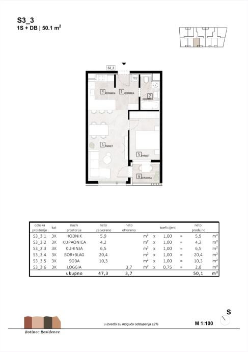 Stan S 3_3 nalazi se na trećem katu površine 50,10 m2, a sastoji se od hodnika, kupaonice, kuhinje, boravka s blagavaonicom, spavaće sobe i loggie.