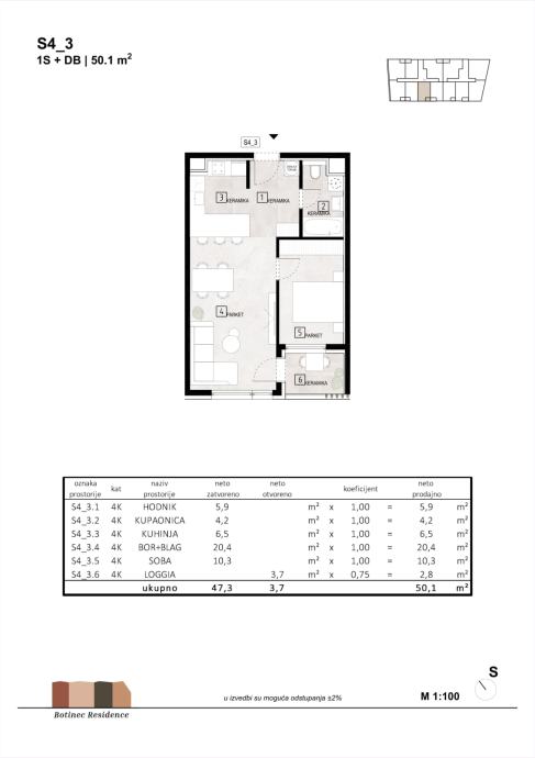 Stan S 4_3 nalazi se na četvrtom katu površine 50,10 m2, a sastoji se od hodnika, kupaonice, kuhinje, boravka s blagavaonicom, spavaće sobe i loggie.