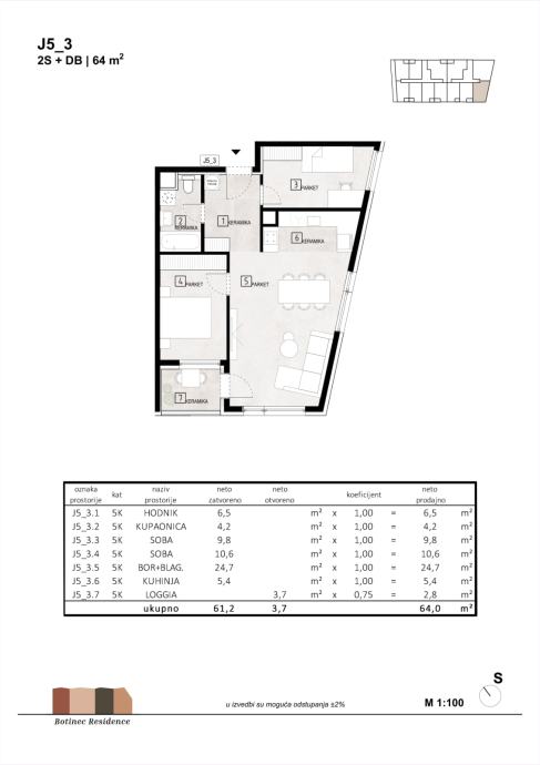 Stan J 5_3 nalazi se na petom katu površine 64,00 m2, a sastoji se od hodnika, kupaonice, kuhinje, boravka s blagavaonicom, dvije spavaće sobe i loggie.