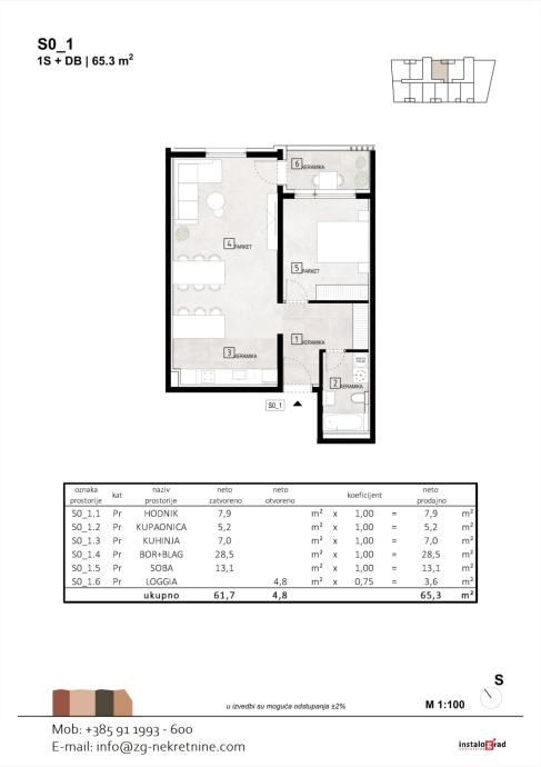 Stan S 0_1 nalazi se u prizemlju površine 49,78 m2, a sastoji se od hodnika, kupaonice, kuhinje, boravka s blagovaonicom, spavaće sobe i loggie.