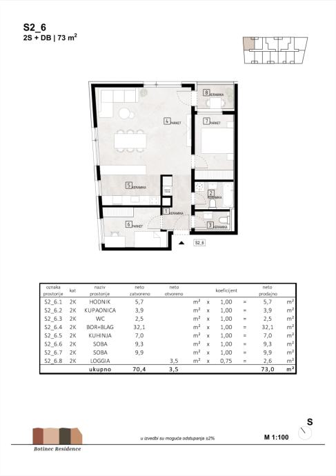 Stan S 2_6 nalazi se na drugom katu površine 73,00 m2, a sastoji se od hodnika, kupaonice, wca, kuhinje, boravka s blagavaonicom, dvije spavaće sobe i loggie.