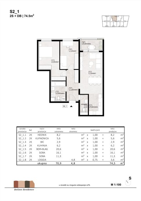 Stan S 2_1 nalazi se na drugom katu površine 74,50 m2, a sastoji se od hodnika, kupaonice, wca, kuhinje, boravka s blagavaonicom, dvije spavaće sobe i loggie.