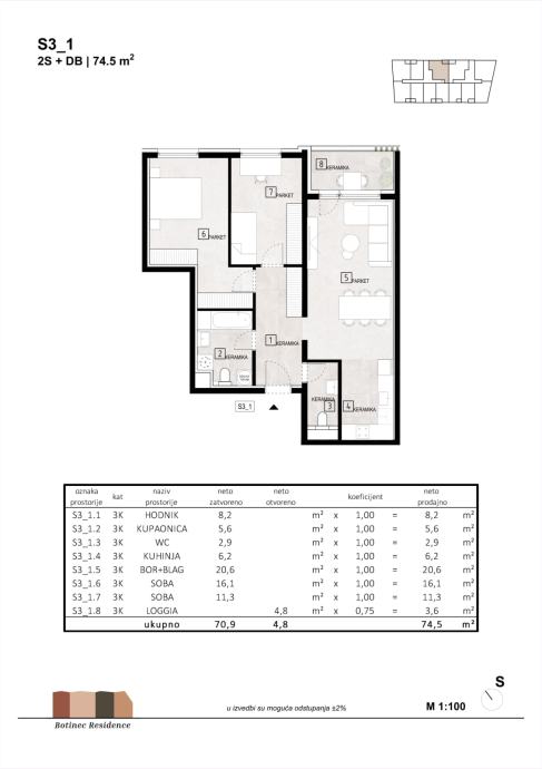 Stan S 3_1 nalazi se na trećem katu površine 74,50 m2, a sastoji se od hodnika, kupaonice, wca, kuhinje, boravka s blagavaonicom, dvije spavaće sobe i loggie.
