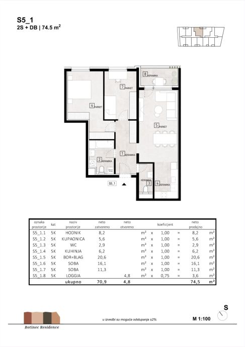 Stan S 5_1 nalazi se na petom katu površine 74,50 m2, a sastoji se od hodnika, kupaonice, wca, kuhinje, boravka s blagavaonicom, dvije spavaće sobe i loggie.