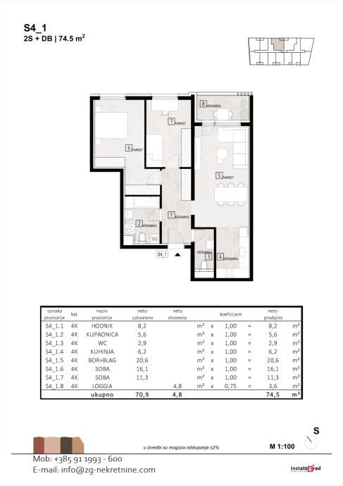 Stan J 4_1 nalazi se na četvrtom katu površine 75,90 m2, a sastoji se od hodnika, kupaonice, kuhinje, boravka s blagovaonicom, dvije spavaće sobe, wc-a i loggie.