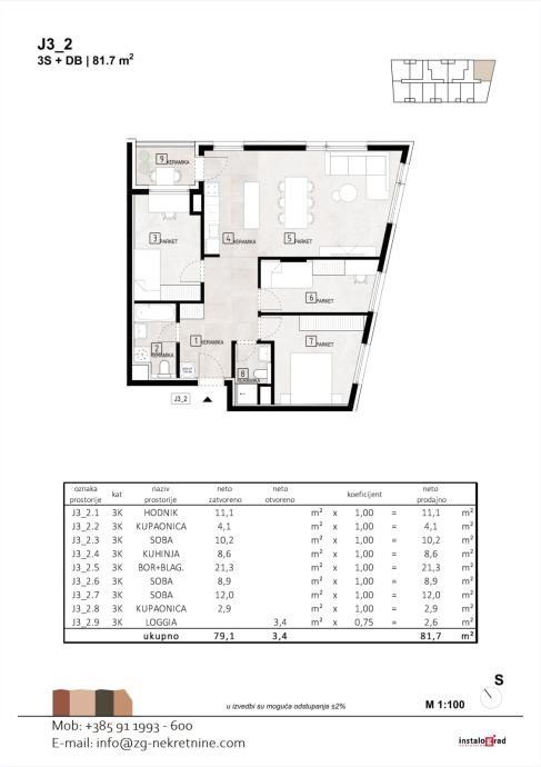 Stan J 3_2 nalazi se na trećem katu površine 81,70 m2, a sastoji se od hodnika, dvije kupaonice, kuhinje, boravka s blagovaonicom, tri spavaće sobe i loggie.