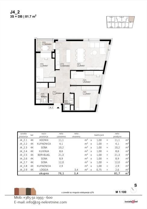 Stan J 4_2 nalazi se na četvrtom katu površine 81,70 m2, a sastoji se od hodnika, dvije kupaonice, kuhinje, boravka s blagovaonicom, tri spavaće sobe i loggie.