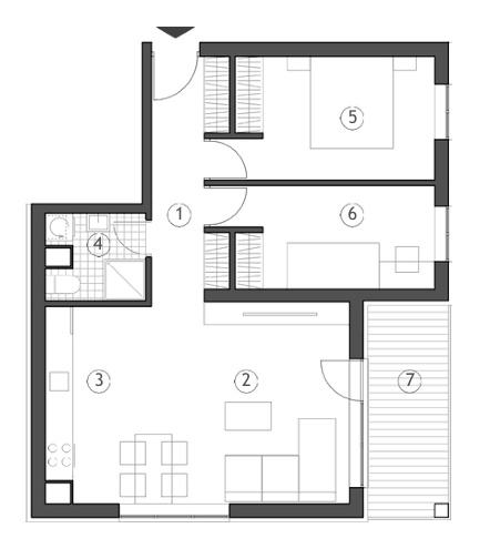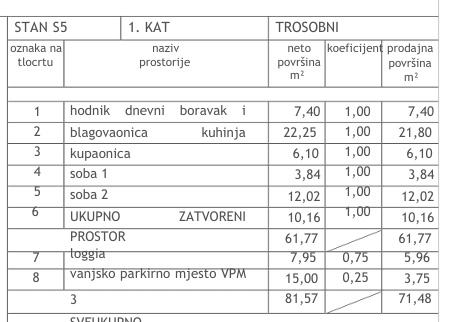 Stan (S5) sastoji se od ulaznog prostora, dnevnog boravka povezanog s kuhinjom i blagovaonicom, dvije spavaće sobe, kupaonice i loggie, neto površine 69,70 m2. Modernog je dizajna s open space konceptom, nalazi se na prvom katu. Loggia je orijentirana prema istoku, tako da nikada neće biti suviše vruće na njoj. Obiluje svjetlom i biti će opremljen kvalitetnim materijalima, hrastovim podovima, visokokvalitetnim sanitarijama s ugradbenim vodokotlićima. Grijanje je etažno plinsko centralno, a očekuje se visoki energetski certifikat zbog kvalitetne stolarije i termofasade.