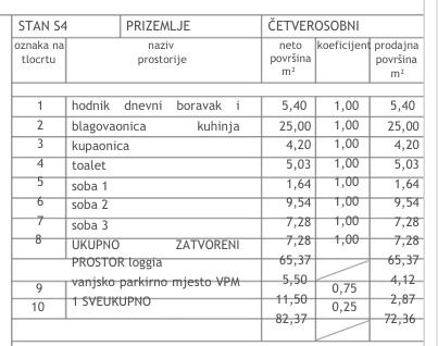Stan (S4) sastoji se od ulaznog prostora, dnevnog boravka povezanog blagovaonicom, kuhinje, tri spavaće sobe, kupaonice, toaleta i loggie, neto površine 69,49 m2. Modernog je dizajna s open space konceptom, nalazi se u prizemlju, ali s južne strane na kojoj je loggia, više je od klasičnog prizemlja s otvorenim pogledom. Obiluje svjetlom i biti će opremljen kvalitetnim materijalima, hrastovim podovima, visokokvalitetnim sanitarijama s ugradbenim vodokotlićima. Grijanje je etažno plinsko centralno, a očekuje se visoki energetski certifikat zbog kvalitetne stolarije i termofasade.