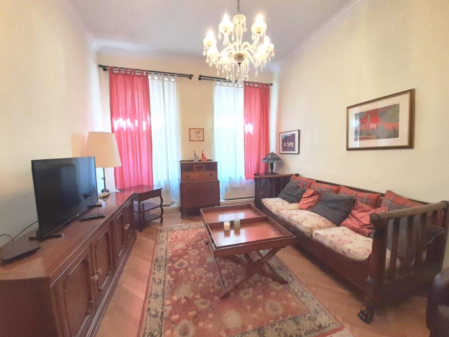 Stan u visokom prizemlju, površine cca. 115m2 sastoji se od dnevnog boravka, glavne spavaće sobe, dječje sobe, kupaonice, wc-a, radne sobe, potpuno opremljene kuhinje s blagovaonicom, pogledom na dvorište s izlazom na prostranu terasu. Kuhinja je opremljena sa svim potrebnim aparatima, centralno plinsko grijanje, klima uređaj. Agencijska provizija jedna najamnina.