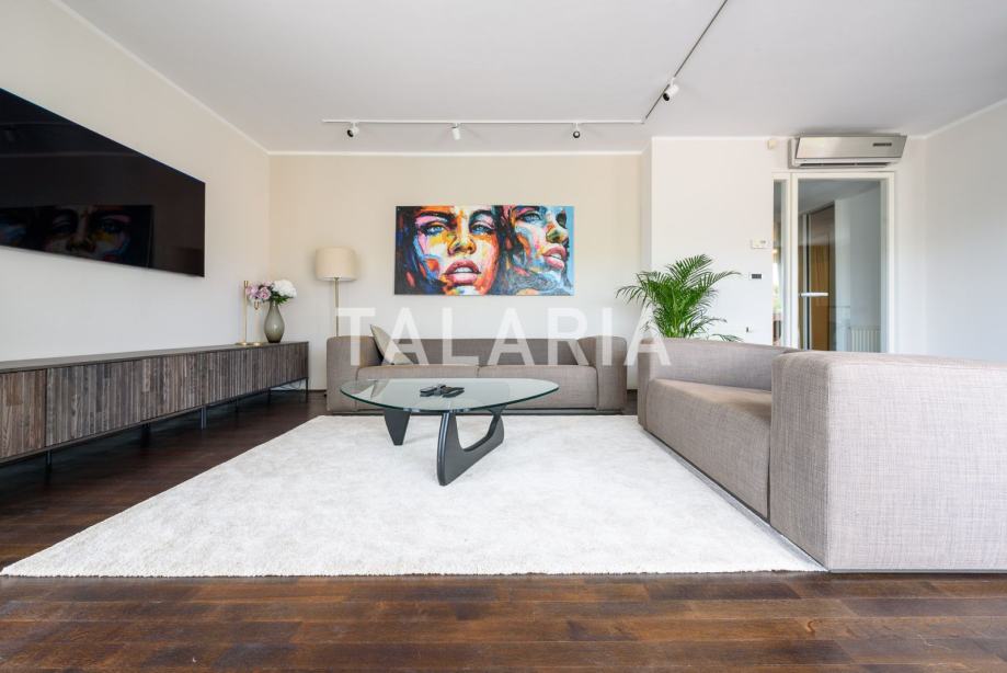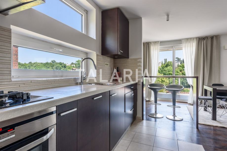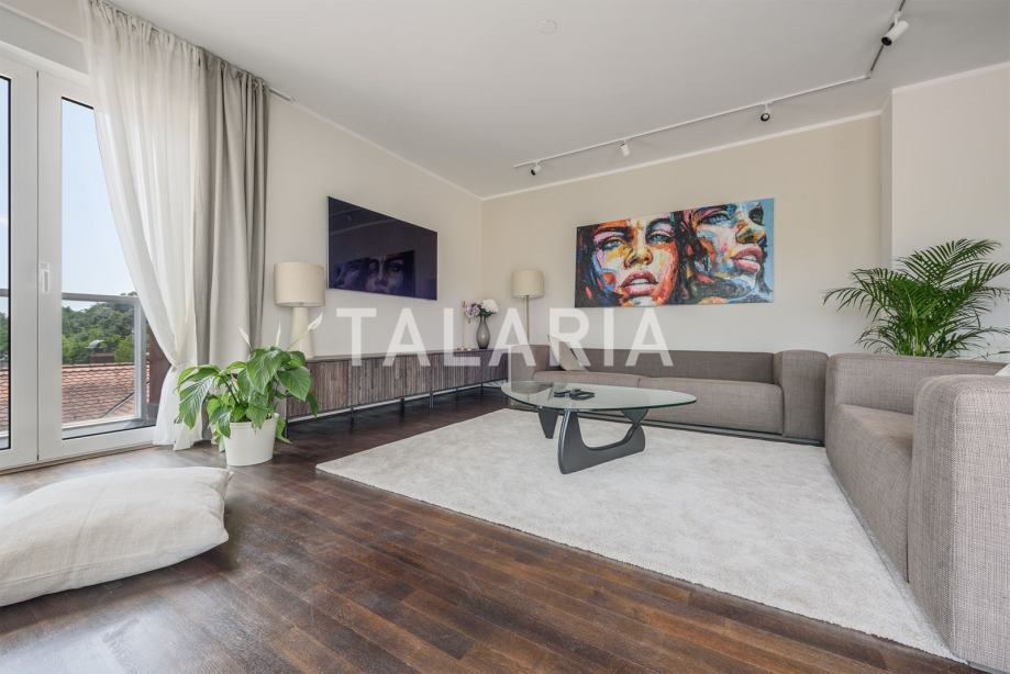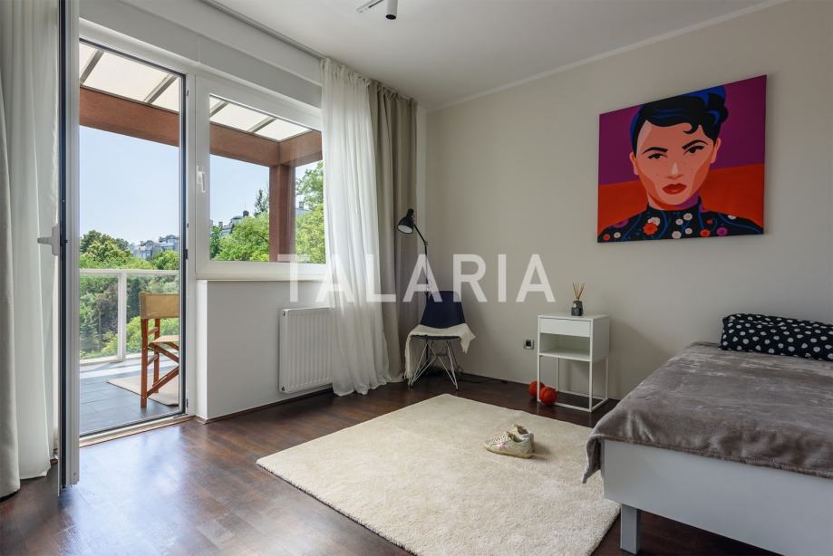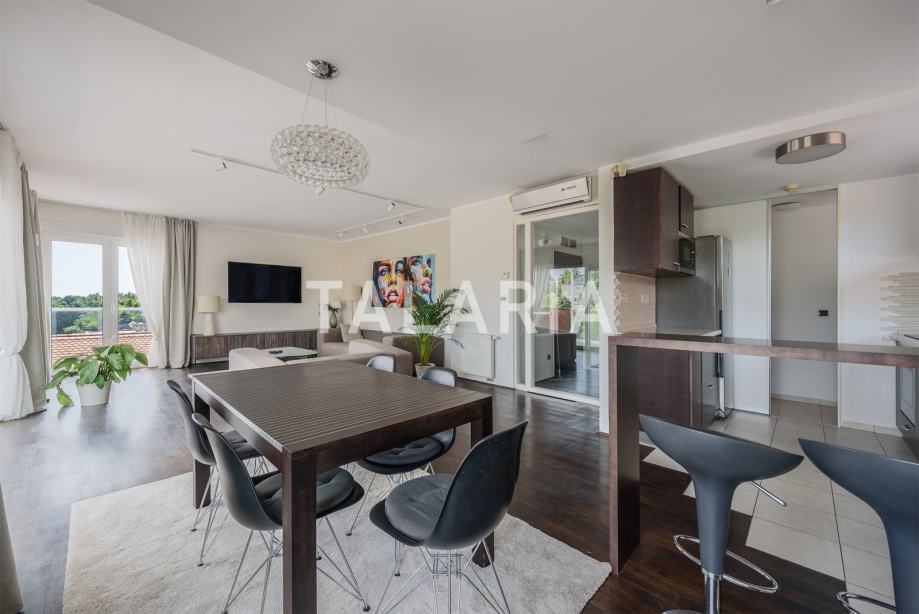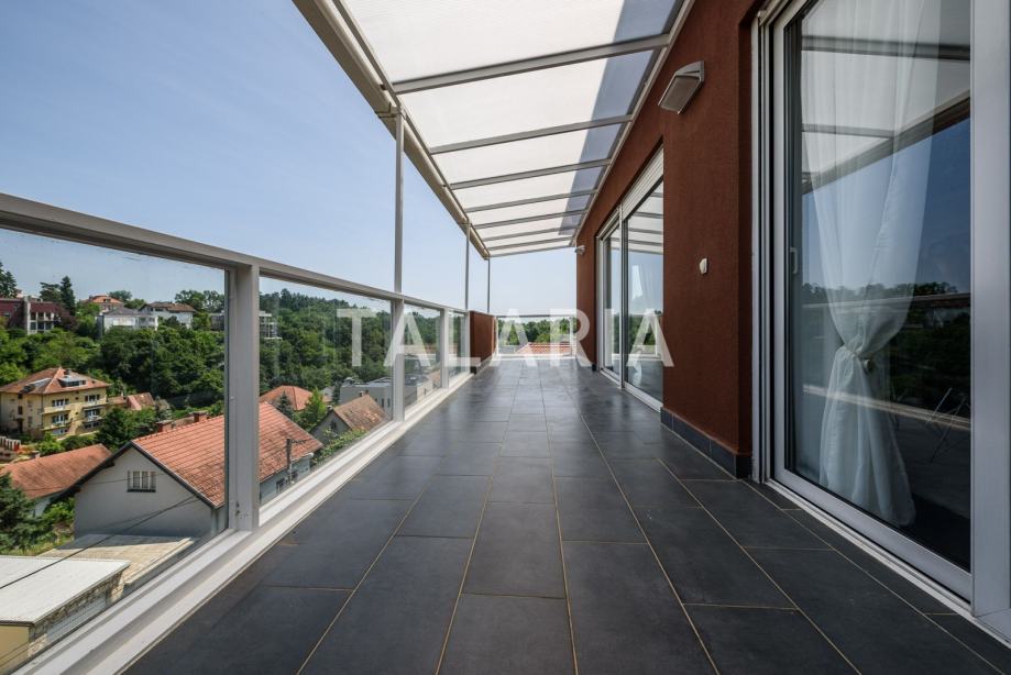 Predivan penthouse u manjoj urbanoj vili, prostire se preko cijele etaže i otvoren je na 4 strane svijeta. Odlično je tlocrtno organiziran. Ulaz po sredini stana vodi nas u hodnik s garderobom i gostinjskim WCom iz kojeg na lijevu stranu odlazimo u intimni dio stana sa 3 spavaće sobe i kupaonom (kada). Dvije sobe dijele prelijepu natkrivenu terasu. Desna strana hodnika otvara se prema prelijepom dnevnom boravku povezanom s blagovaonicom i kuhinjom. Ovaj open plan prostor opasan je staklenim stijenama koje se nastavljaju na predivnu natkrivenu terasu orjentiranu na istok i jug, s čarabnim otvorenim pogledom prema šumi. Stanu pripada dupla garaža i spremište u podrumu. Odličan stan i zgrada. Kvalitetna gradnja, aluminijska stolarija, mirna ulica. Preporuka agencije.
