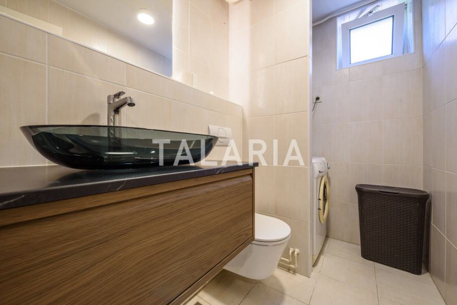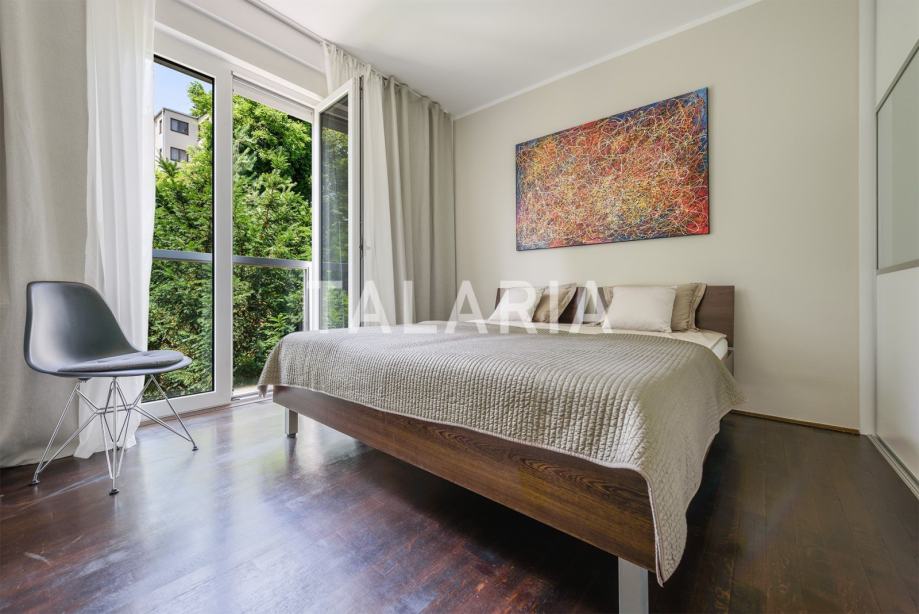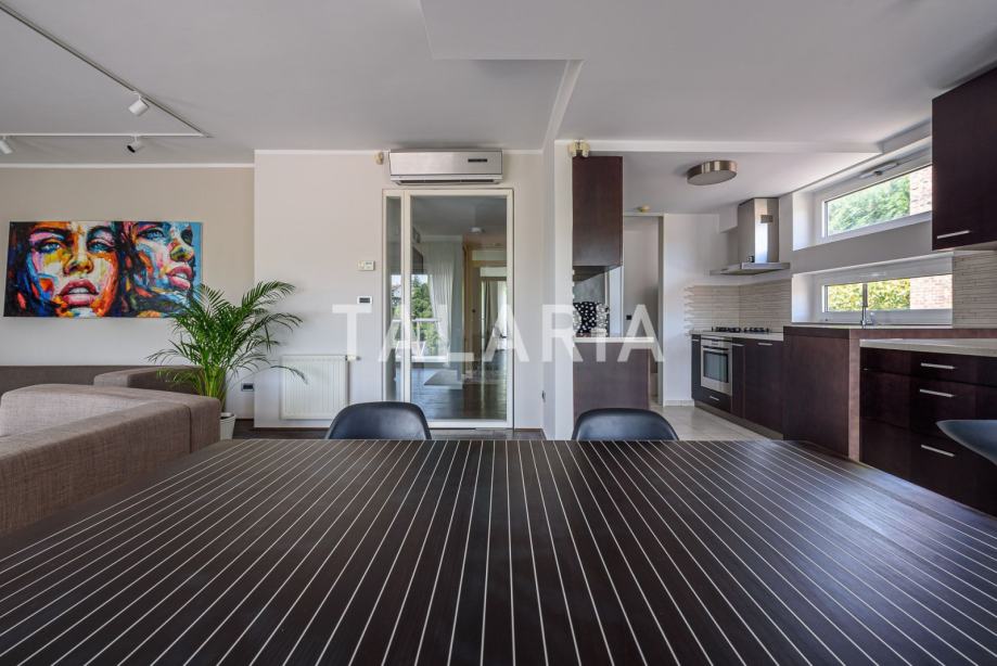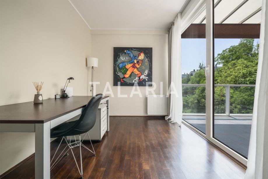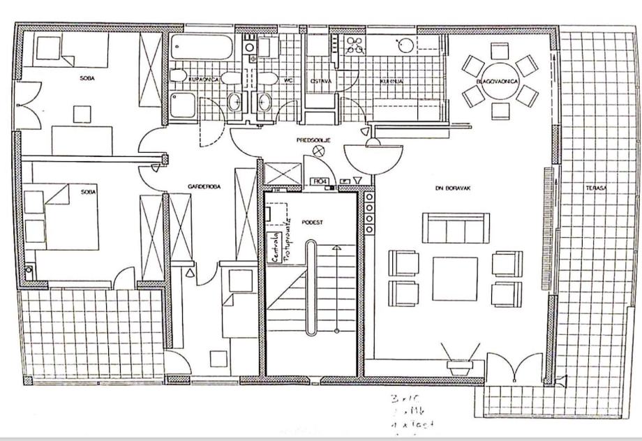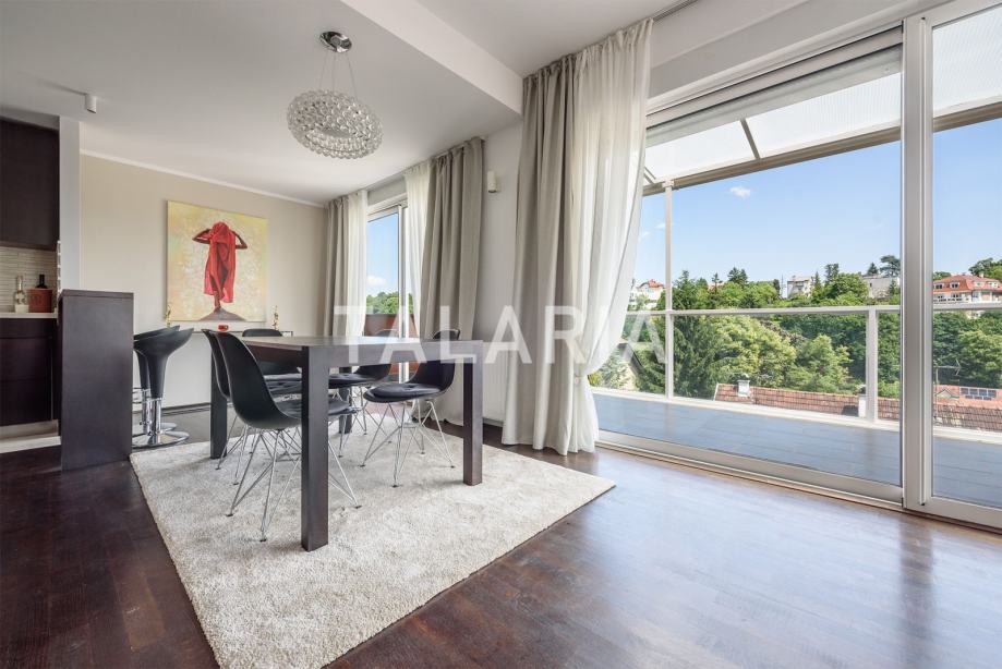 Predivan penthouse u manjoj urbanoj vili, prostire se preko cijele etaže i otvoren je na 4 strane svijeta. Odlično je tlocrtno organiziran. Ulaz po sredini stana vodi nas u hodnik s garderobom i gostinjskim WCom iz kojeg na lijevu stranu odlazimo u intimni dio stana sa 3 spavaće sobe i kupaonom (kada). Dvije sobe dijele prelijepu natkrivenu terasu. Desna strana hodnika otvara se prema prelijepom dnevnom boravku povezanom s blagovaonicom i kuhinjom. Ovaj open plan prostor opasan je staklenim stijenama koje se nastavljaju na predivnu natkrivenu terasu orjentiranu na istok i jug, s čarabnim otvorenim pogledom prema šumi. Stanu pripada dupla garaža i spremište u podrumu. Odličan stan i zgrada. Kvalitetna gradnja, aluminijska stolarija, mirna ulica. Preporuka agencije.