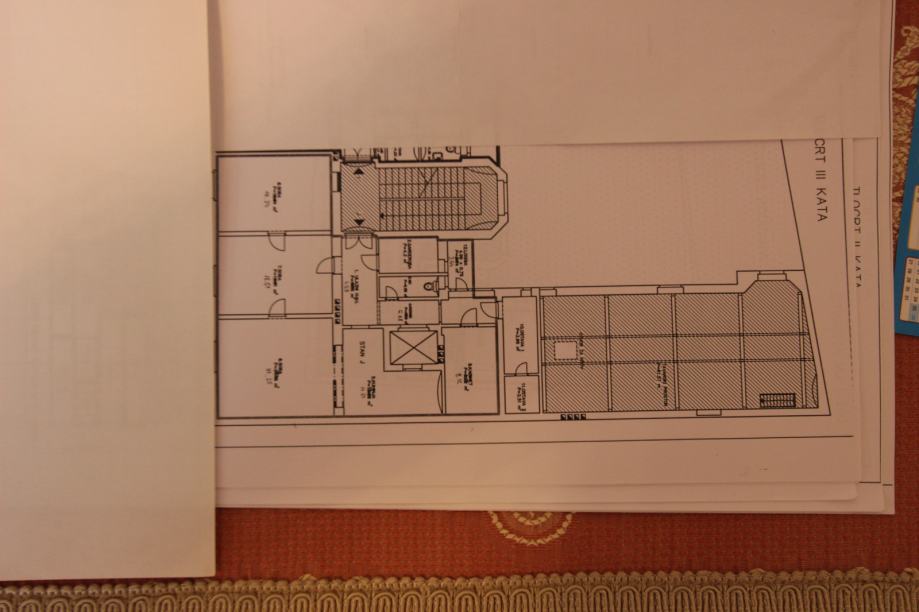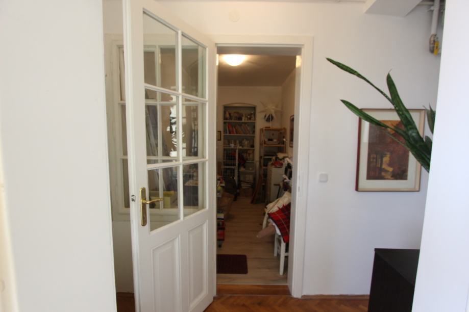 Stan se sastoji od ulaznog hodnika, tri velike povezane sobe, sobica, dnevni dio s kuhinjom i blagovanjem, lođa.