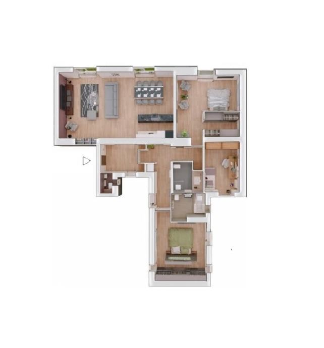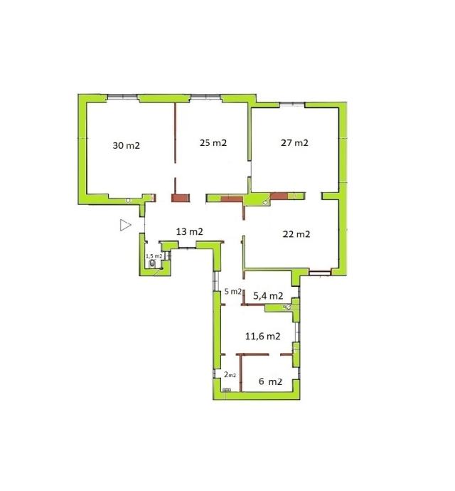 Četiri velike i jedna manja soba, kuhinja, kupaonica, wc, ostava. 143,58 m2 (u naravi 148 m2), visina stropova 2,9 m.