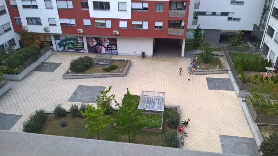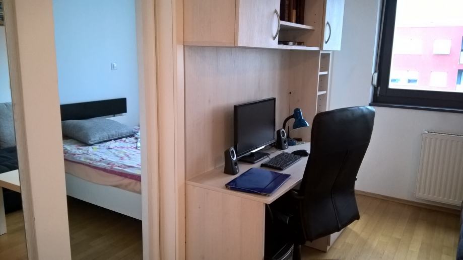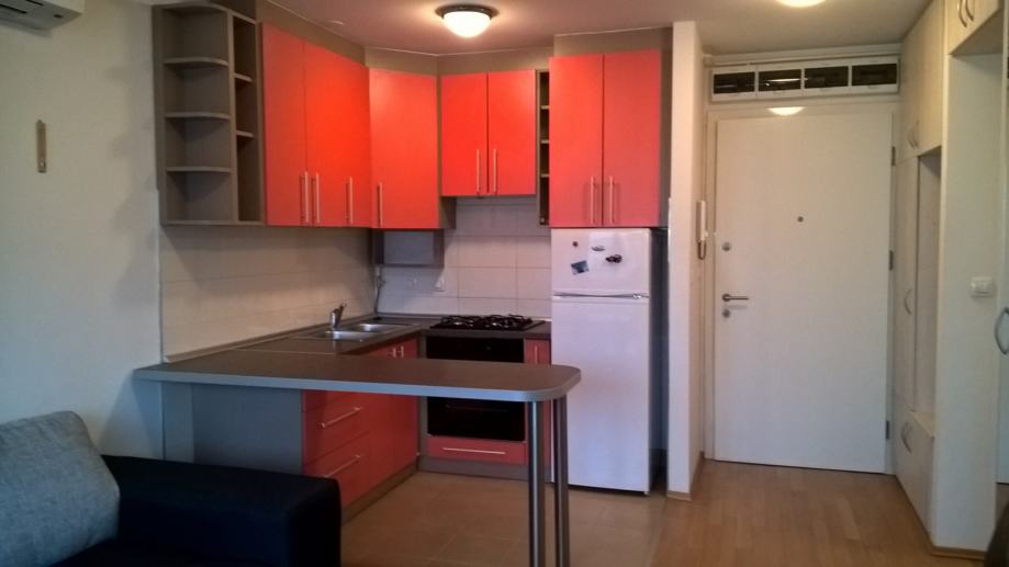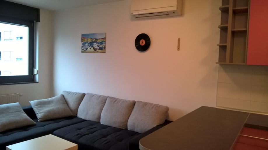 Iznajmljuje se malo korišteni potpuno namješteni stan na 5. katu zgrade s liftom. Sastoji se od ulaznog hodnika, sobe s kuhinjom i blagovaonicom, kupaonice i spavaće sobe. Grijanje je etažno plinsko, i dodatno električno podno u kupaonici, klima, vlastito brojilo za vodu, plin i struju, pogled u dvorišni dio zgrade (nema buke s ulice), blizina tramvaja, tržnice, autobusnog i željezničkog kolodvora.