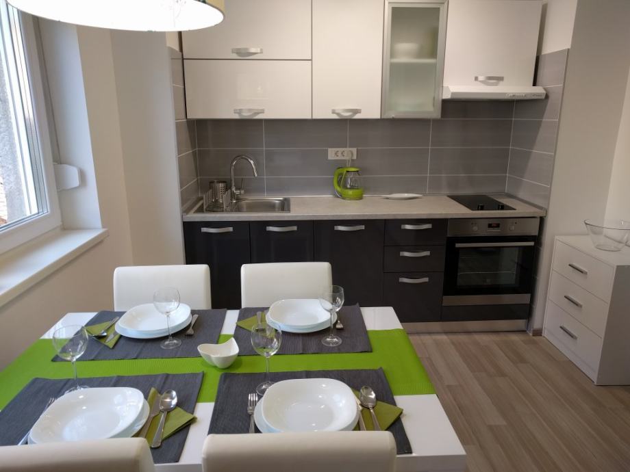 Kuhinja je moderna i opremljena svim aparatima (ugradbena perilica posuđa, ugradbeni frižider, indukcijska ploča, pečnica).