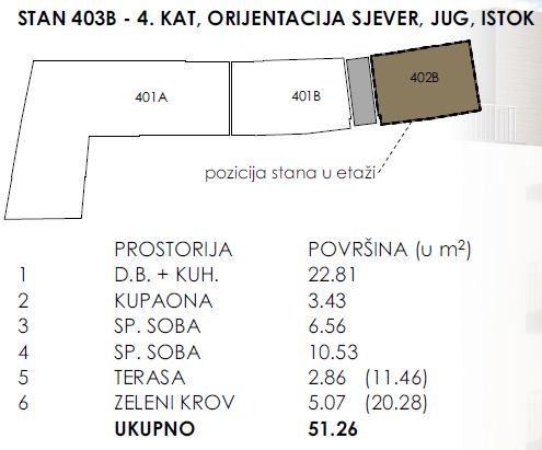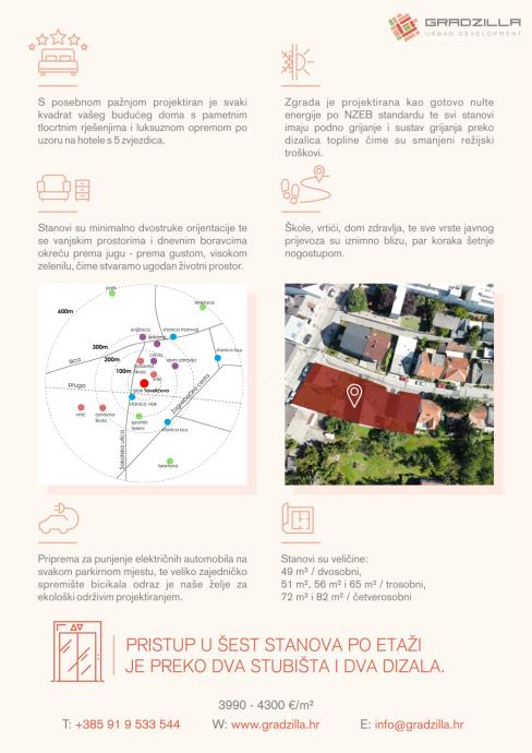 21 stan raspoređen na 5 etaža do kojih se pristupa kroz dva stubišta i dva dizala