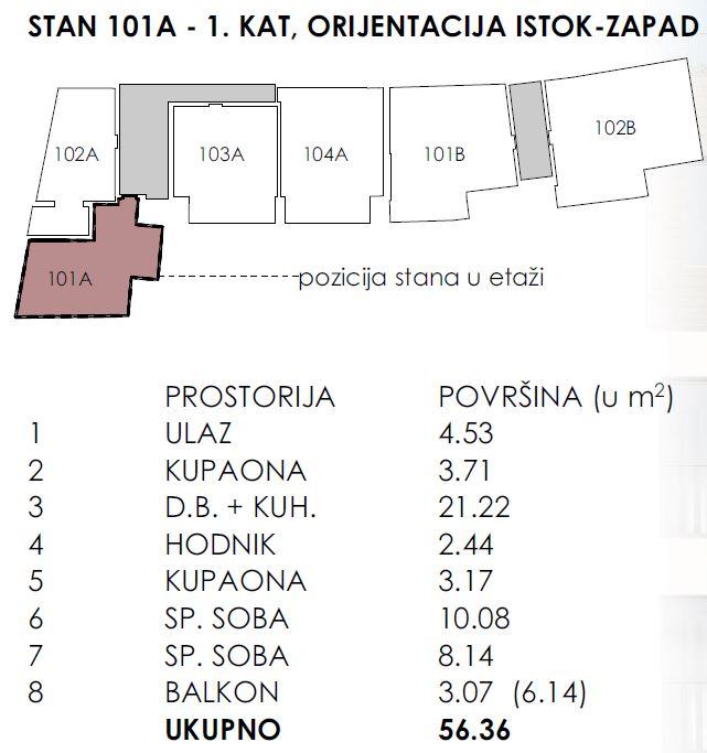 21 stan raspoređen na 5 etaža do kojih se pristupa kroz dva stubišta i dva dizala