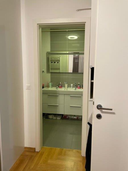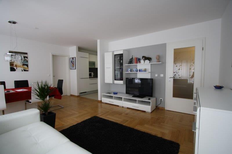Iznajmljuje se stan površine 60m2 koji se nalazi na drugom katu novije stambene zgrade u blizini trga dr. Franje Tudjmana. Stan je južne orijentacije, vrlo prozračan i pun svjetla. Stan se sastoji od ulaznog prostora zaštićenog sa protuprovalnim vratima i namještenog sa prostranim garderobnim ormarom, klimatiziranog dnevnog boravka s blagovaonicom i kuhinjom u jednoj funkcionalnoj cjelini, klimatizirane spavaće sobe s bračnim ležajem, prostranim garderobnim ormarom i komodom, velike kupaonice sa kadom i WC-om, manje kupaonice sa tuš kabinom i WC-om.