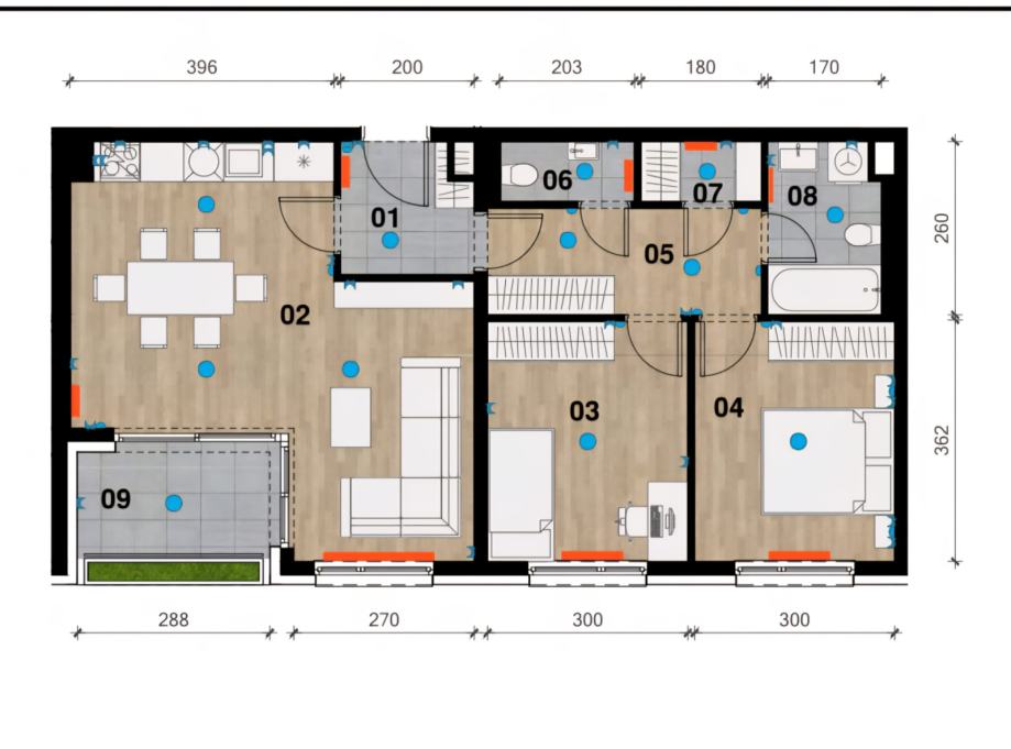 Stan se nalazi na 2. katu i sastoji se od ulaznog hodnika, open space dnevnog boravka s izlazom na loggiu veličine 6 m2 , kuhinje, blagavaonice dvije spavaće sobe i dvije kupaonice (tuš kabina i kada), ukupne površine 71,90m2. Orijentacija stana je južna.
