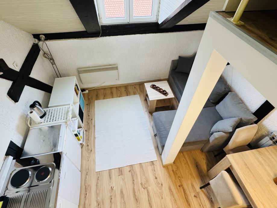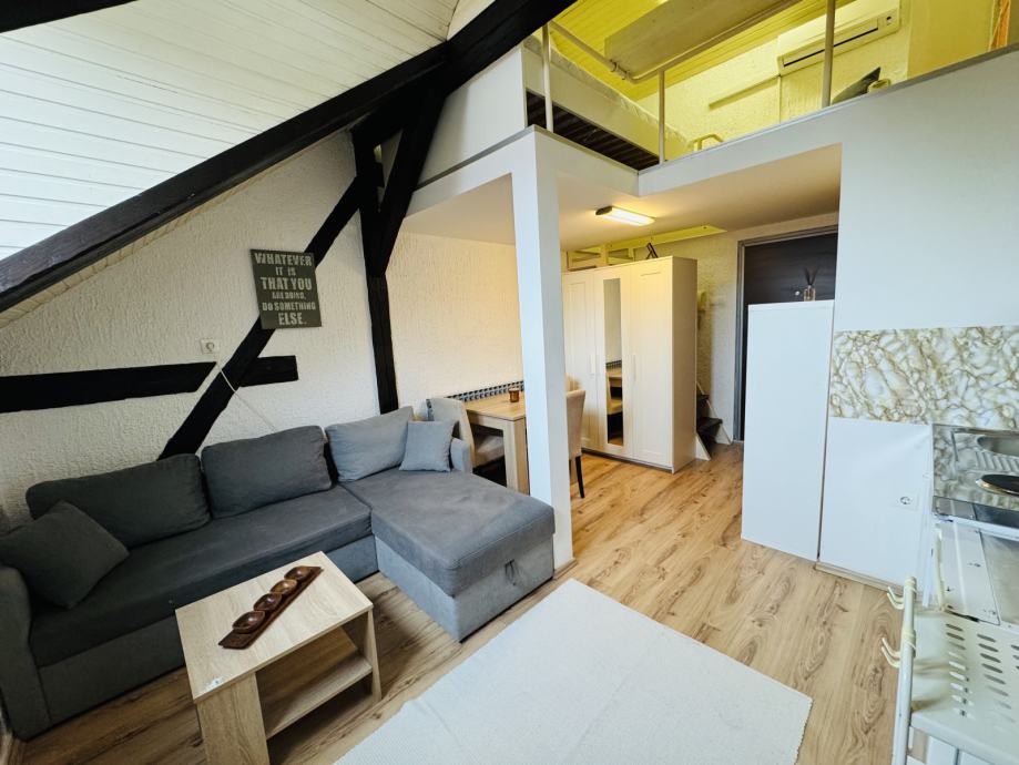 Vrlo ugodna i praktična, idealna za samce i studente. Nalazi se na trećem katu, a sastoji se od galerije s velikim krevetom, kuhinje i malog dnevnog boravka, kupaonice s tušem, te dodatnog WC-a koji se nalazi neposredno preko puta stana i dijeli se s još jednim stanom.