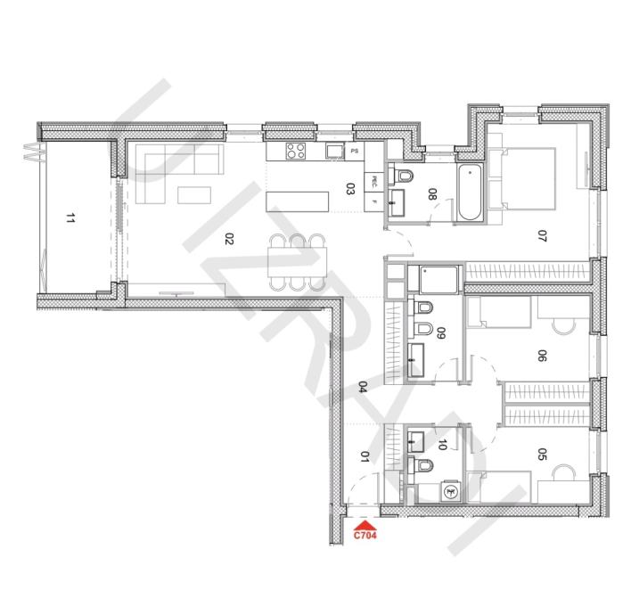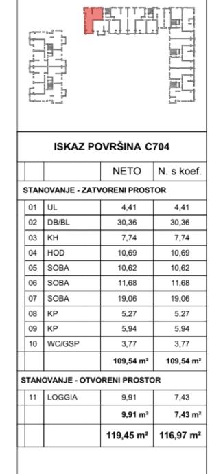 Stan se sastoji od ulaznog prostora koji vodi u prostrani dnevni boravak s blagovaonicom. Ovaj prostor je savršeno osmišljen za obiteljska okupljanja i opuštanje, a velike staklene površine omogućuju obilje prirodne svjetlosti, čineći prostor svijetlim i zračnim. Kuhinja je odlično povezana s blagovaonicom, stvarajući otvoreni prostor za kuhanje i uživanje u zajedničkim obrocima. U stanu su tri spavaće sobe, od kojih jedna ima vlastitu kupaonicu, što omogućava privatnost i udobnost za vlasnike, dok preostale dvije spavaće sobe dijele drugu kupaonicu koja je moderno uređena i opremljena visokokvalitetnim sanitarijama. Dodatni WC nalazi se izvan spavaćih prostorija, pružajući praktičnost i udobnost za sve ukućane i goste. Stan također uključuje loggiu, idealnu za uživanje u svježem zraku ili kao prostor za odmor nakon napornog dana.