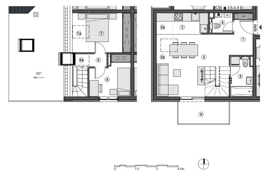 Trosoban, dvoetažni stan u potkrovlju površine 63 m2, orijentacije na jug i zapad sa pripadajućim parkirnim mjestom i spremištem.
