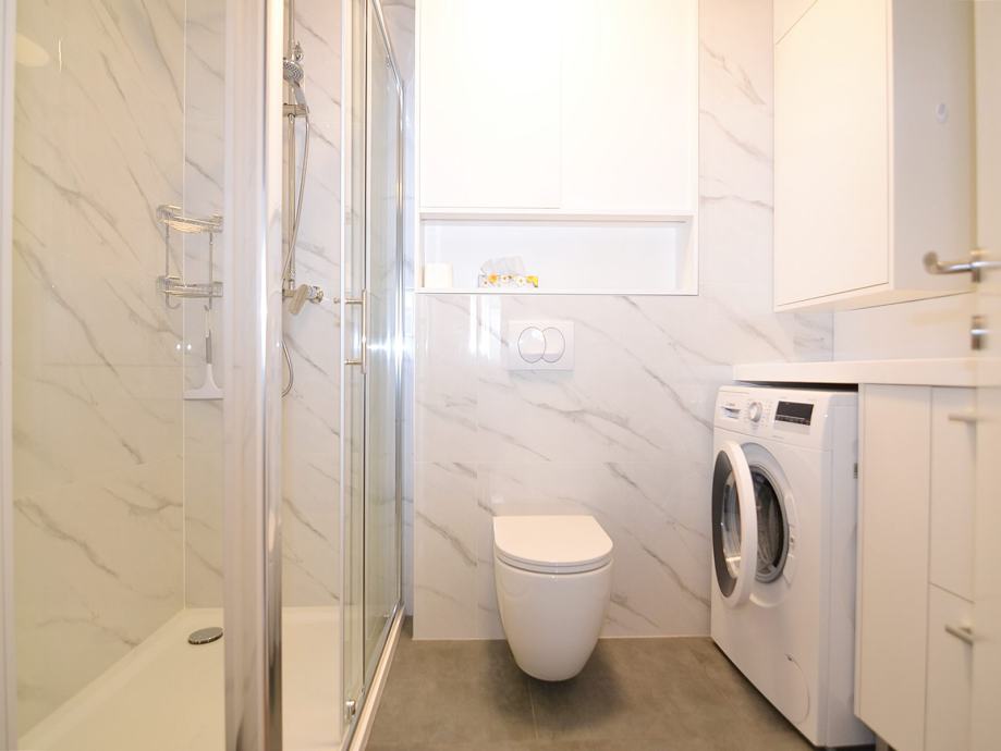 It consists of a hallway, kitchen (incl.dishwasher) with dining and living area with balcony, 2 bedrooms, 1 bathroom with toilet and 1 storage / laundry (incl.washing machine).