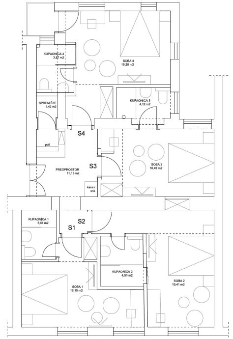 Prodaje se nekretnina na 1. katu zgrade, u knjigama upisana kao poslovni prostor, a u naravi uređene 4 luksuzne sobe za najam.