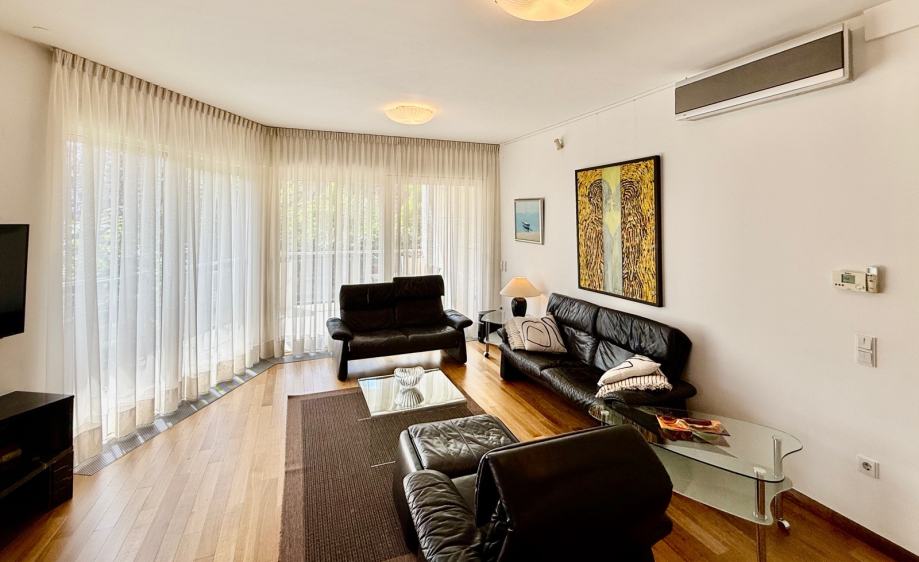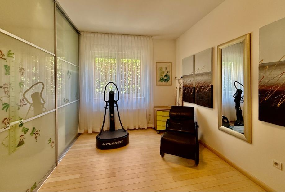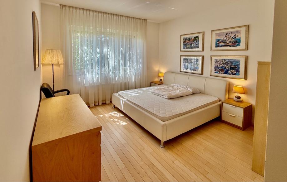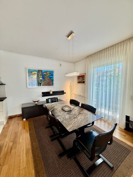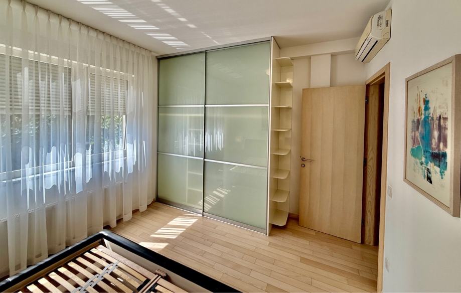 Iznajmljujem prekrasan stan sa tri spavaće sobe dvije kupaone i open space boravkom, blagovaonom, kuhinjom i kaminom, povezanom s balkonom i loggiom, na mirnoj i tihoj lokaciji u sporednoj slijepoj ulici na Srebrnjaku sa pogledom na zelenilo. Stanu pripada i dupla garaža i sjenica u posebnom dijelu vrta cca 100m2. Autobusna linija do Kaptola (10min) ili Kvatrića (5 min) u neposrednoj blizini. Ulica nanovo asfaltirana i uređena. Blizina međunarodne škole, dječje bolnice, dućana itd. Cijena najma uključuje sve troškove osim potrošnje plina, struje i vode (bez kom naknade, pričuve i odvoza otpada). Besplatan brzi internet sa priključcima u svim sobama kao i jaki wifi, alarm te videonadzor dvorišta i ulaza. Automatska vrata garaže i kolnog ulaza. Potpuno namješten ali po dogovoru može se donijeti i vlastiti namještaj.