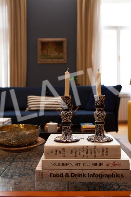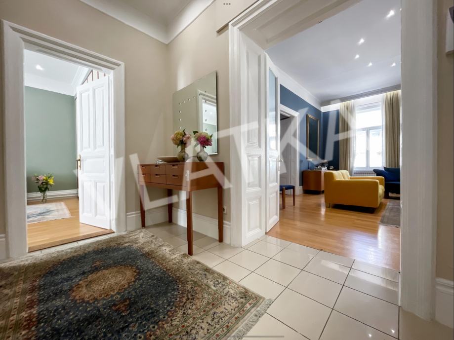 Otmjeno moderan stan od 133 m2, s 3 metra visokim stropovima, sastoji se od: ulaznog hodnika, blagavaonice, dnevnog boravka, kuhinje, ostave, loggie, 3 spavaće sobe, kupaonice i toaleta za goste.