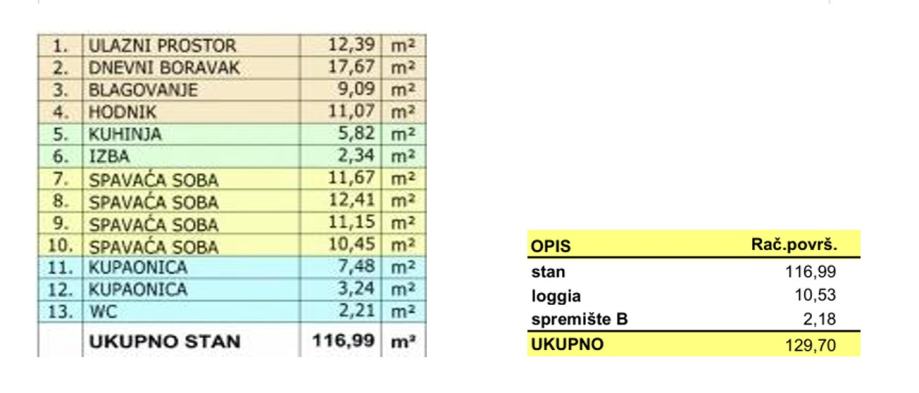 Stan ima ukupno 116,99 m2 stambenog prostora (zatvoreni prostor).