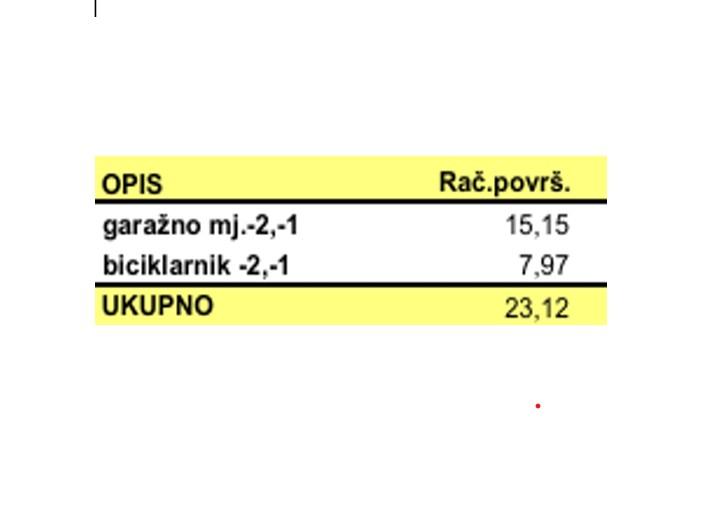Stanu pripada garažno parkirno mjesto s biciklarnikom na -2 etaži, površine 23,12 m2 u zatvorenoj garaži pod video nadzorom.