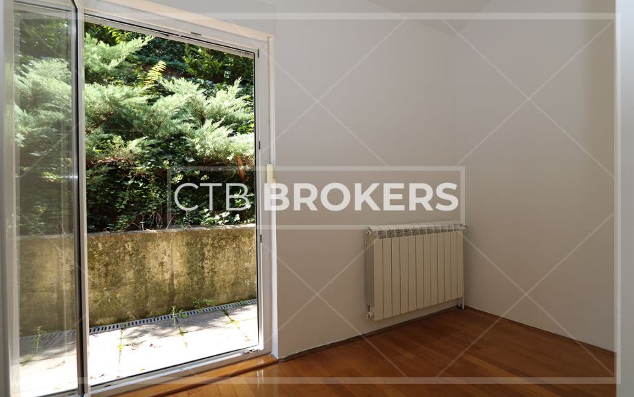 Ovaj stan u prizemlju manje urbane vile sastoji se od prostranog ulaznog prostora s garderobom, potpuno opremljene kuhinje, dnevni boravak i blagovaonica se protežu na 55m2 i imaju izlaz na terasu 28 m2 i vrt veličine 43m2. Stan ima ukupno 3 spavaće sobe od kojih dvije imaju vlastite walk-in garderobe, master kupaonicu s kadom, kupaonicu sa tuš kabinom i spremište. Stanu pripadaju 2 parkirna mjesta u dvorištu kao i spremište u podrumu zgrade.