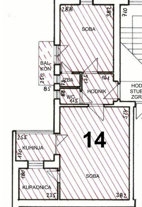 Hodnik, spavaća soba, balkon, dnevna soba, kuhinja, kupaona, odvojeni wc i spremište/izba.