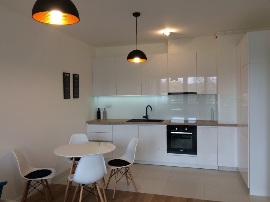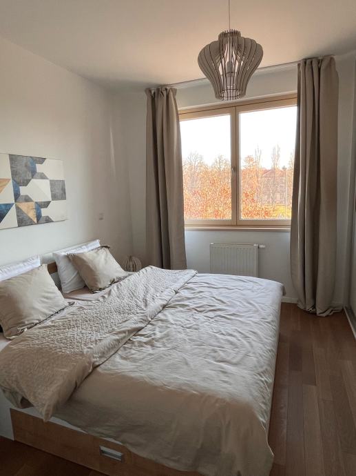 Stan je potpuno namješten. Kuhinja, ugradbeni ormar u hodniku i cijela spavaća soba s ugradbenim ormarom, kupaonski ormarići i ormarić za televizor rađeni po mjeri. Visokokvalitetni električni aparati (perilica i sušilica rublja, perilica posuđa, napa, električna ploča, pećnica, hladnjak, smart tv). Kupaonica s talijanskim (walk-in) tušem. Protuprovalna vrata. Podno grijanje u kupaonici i kuhinji. Dva klima-uređaja.