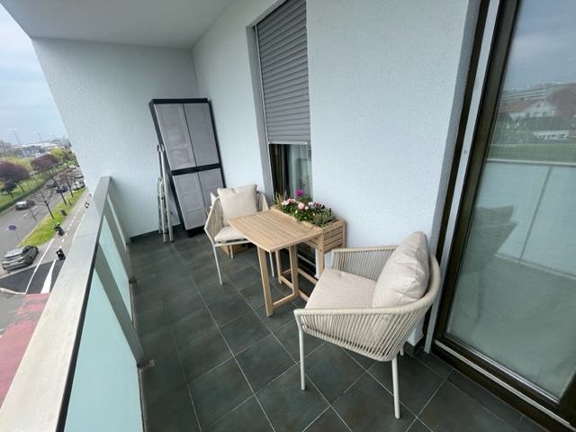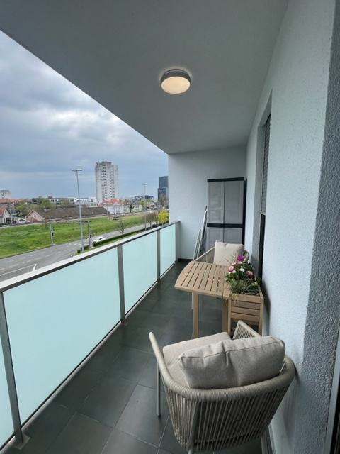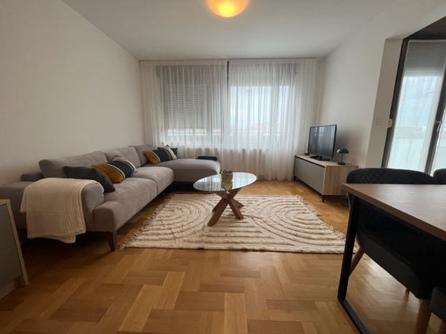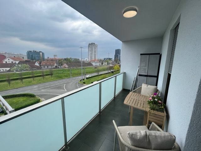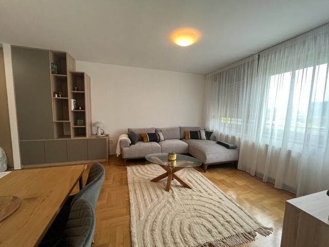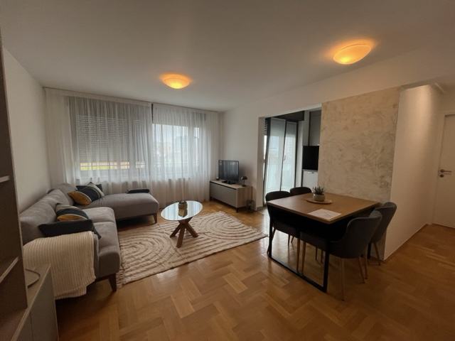 Namješten moderan 3sobni stan u novogradnji koji se sastoji od dvije spavaće sobe, dnevnog boravka, kuhinje, kupaone i terase.