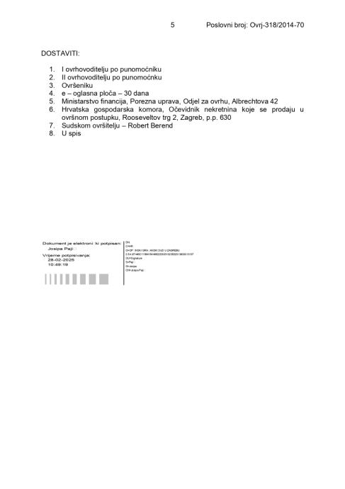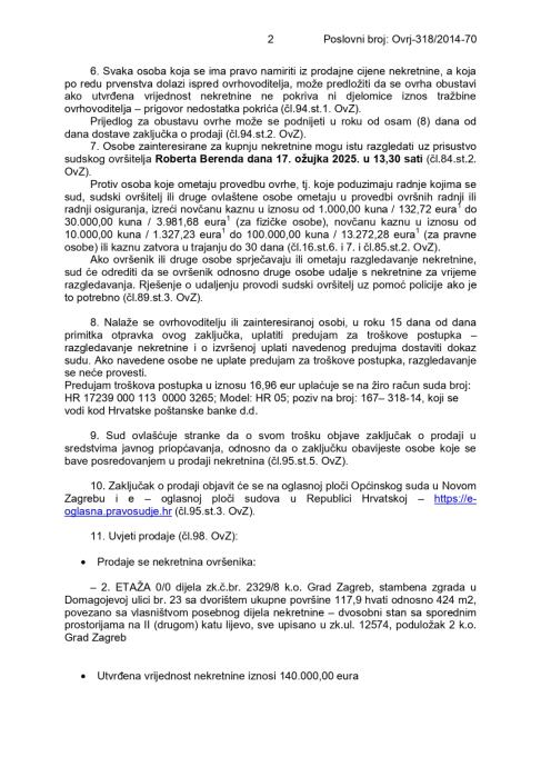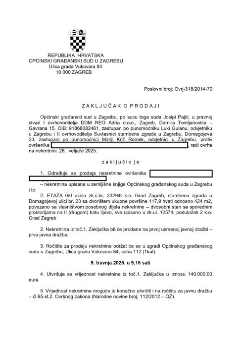 Određuje se prodaja nekretnine upisane u zemljišne knjige Općinskog građanskog suda u Zagrebu