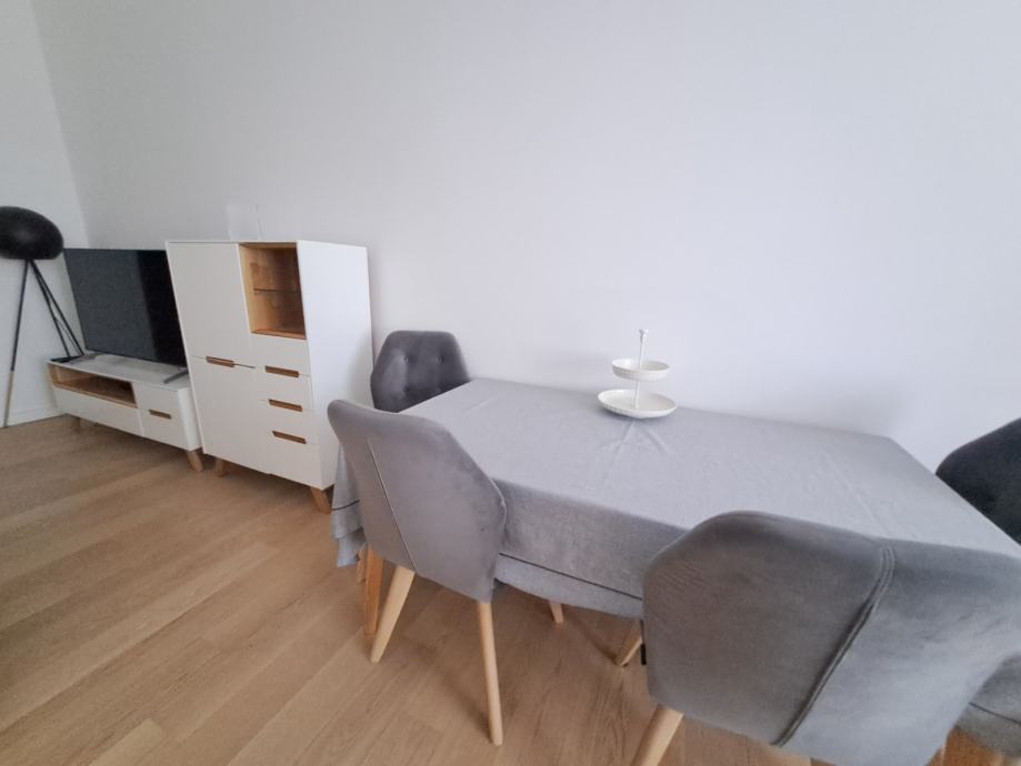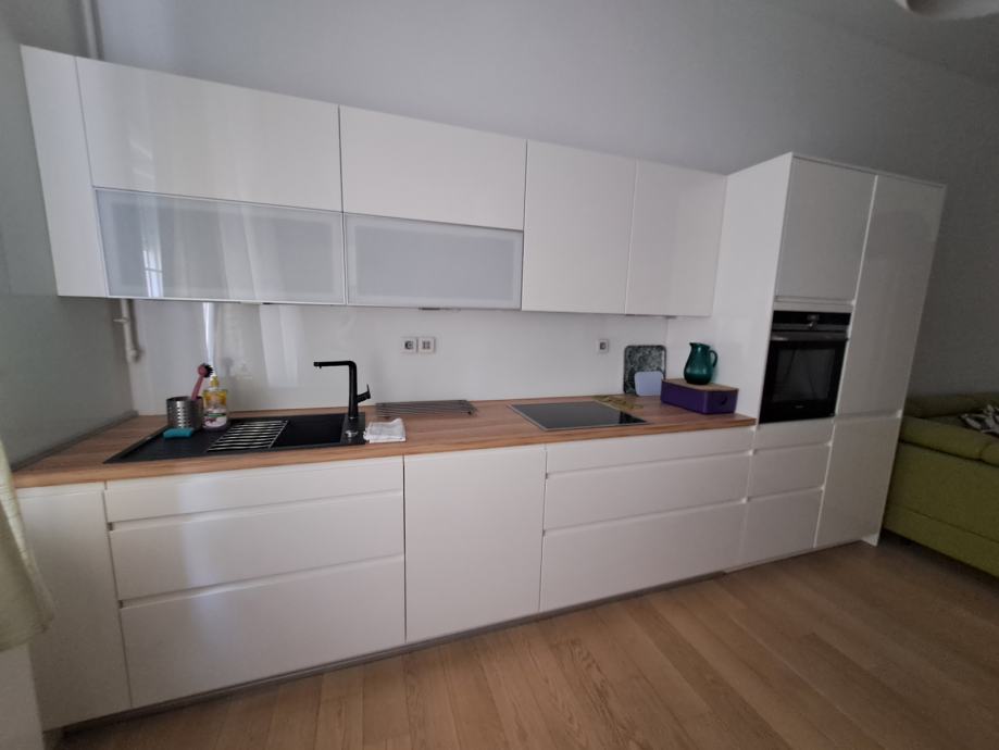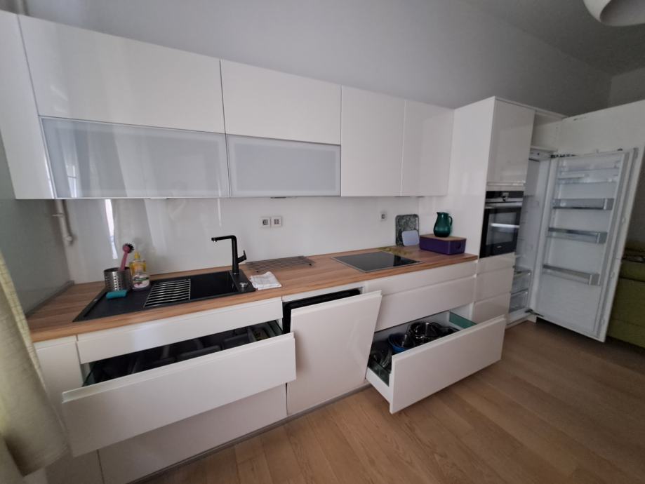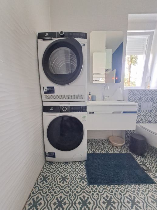 Stan je većinom orijentiran na dvorišnu stranu i zelenilo. Kuhinja i kupaonice su potpuno opremljene (suđerica, pećnica, veš mašina, sušilica).