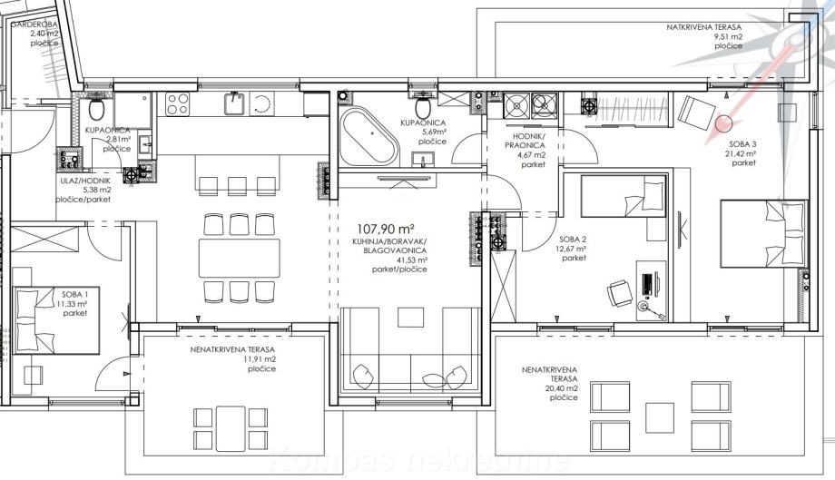 Sastoji se od ulaznog prostora, kuhinje, dnevnog boravka, blagovaone, tri spavaće sobe, kupaonice, toaleta i vešeraja. Dvije sobe imaju izlaz na zatvorenu terasu ( 9,51 m2 ) i otvorenu terasu ( 20,4 m2 ). Treća terasa vidljiva na tlocrtu ( 11,91 m2 ) je kvalitetno zatvorena i dio je dnevnog boravka.