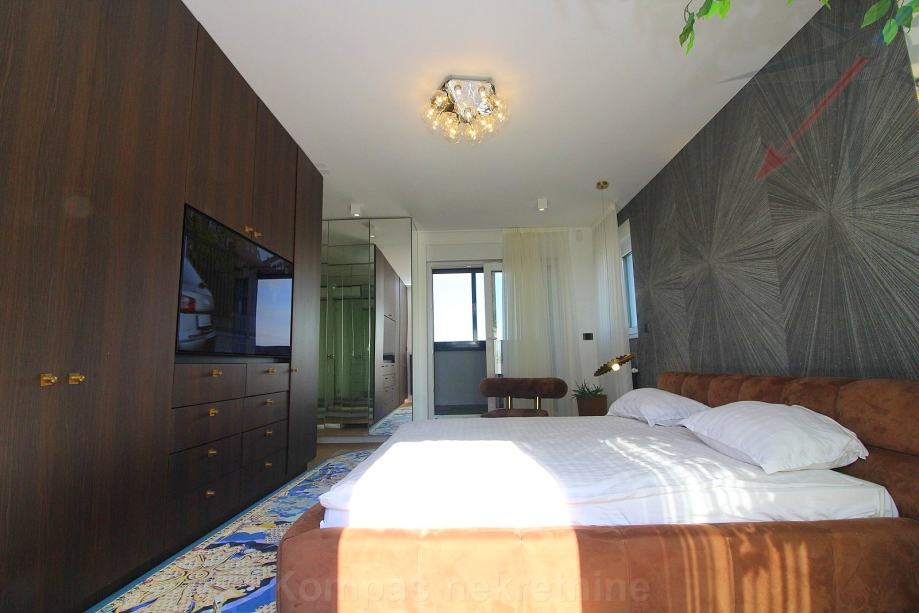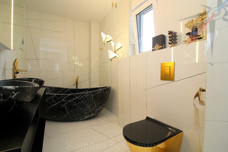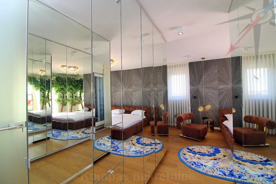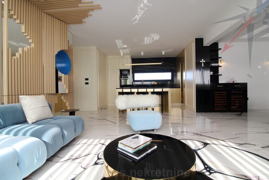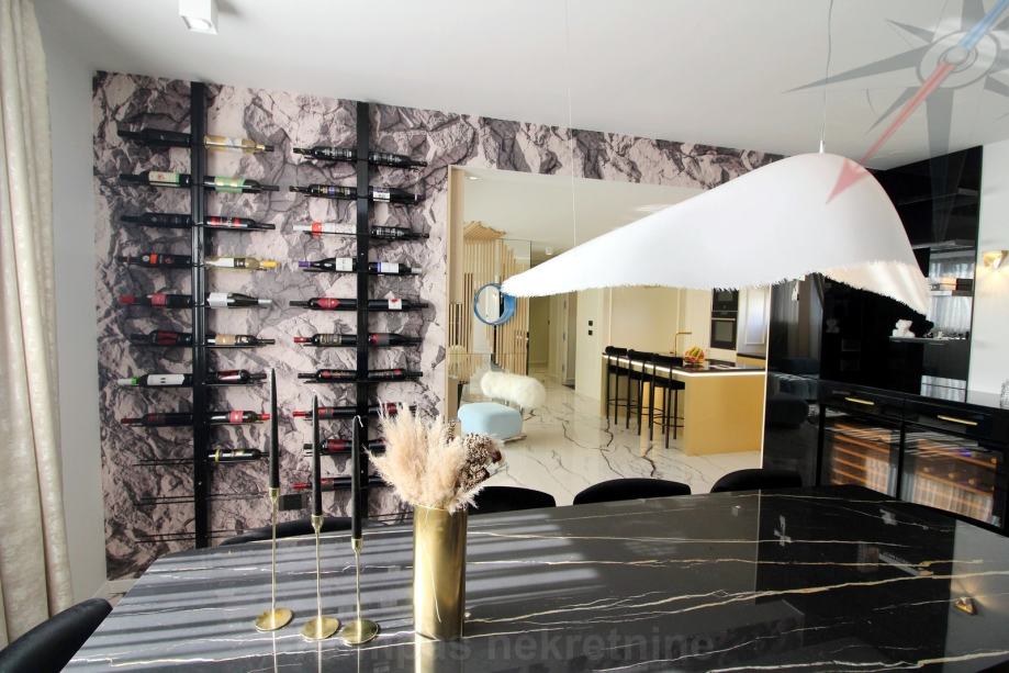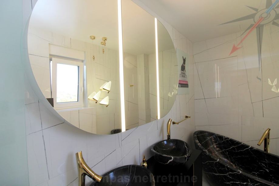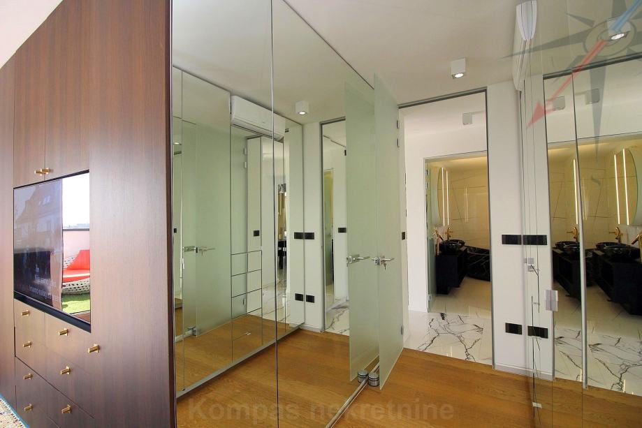 Oprema: video portafon, optički internet, plinsko centralno grijanje, podno plinsko grijanje, klima uređaj, ugradbeni ormari, alarm, klesana mramorna kada, kvalitetan dizajnerski namještaj i oprema ( NEFF, AXOR, MOOOI CARPETS & RUGS ... ).