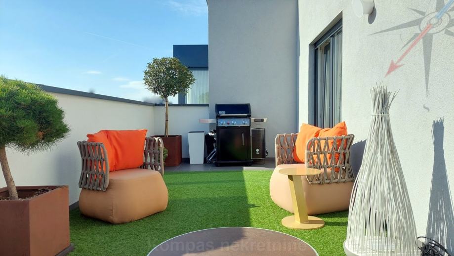 Luxuriously furnished 4-room apartment (119.81 m²) in a new building, Dankovečka street. It consists of an entrance area, kitchen, living room, dining room, three bedrooms, bathroom, toilet and laundry room. Two rooms have access to a closed terrace (9.51 m2) and an open terrace (20.4 m2). The third terrace visible on the floor plan (11.91 m2) is closed and is part of the living room. Equipment: video intercom, optical internet, gas central heating, gas underfloor heating, air conditioning, built-in wardrobes, alarm, carved marble bathtub, quality designer furniture and equipment (NEFF, AXOR, MOOOI CARPETS & RUGS...). Has three parking spaces in the building's garage, one of which is fenced off for storage. The building reserve for the apartment is 55 euros. For sale furnished, the price is fixed. It is located near bus and tram lines, shopping centers, market, two schools.