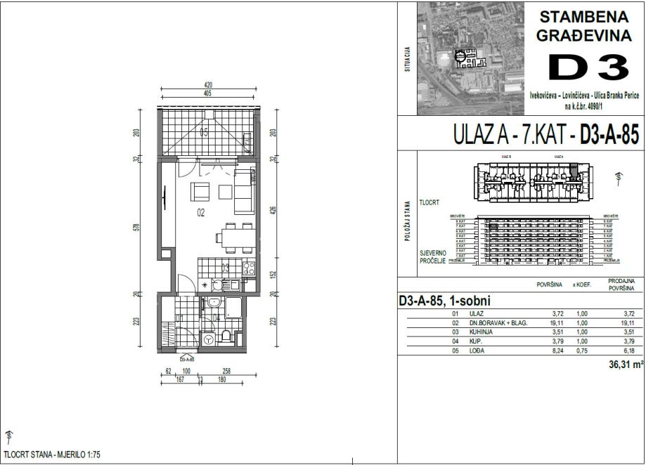Prodaje se jednosobni stan na 7. katu u novogradnji (2023.) na adresi Lovinčićeva ulica 1C, korisne površine 30,13 m2, koji se sastoji od: ulaza, dnevnog boravka, kuhinje, kupaonice, lođe korisne površine 8,24 m2, sveukupne neto korisne površine stana 36,31 m2. Lođa je zatvorena staklenom stijenom. Stan je sjeverne orijentacije.