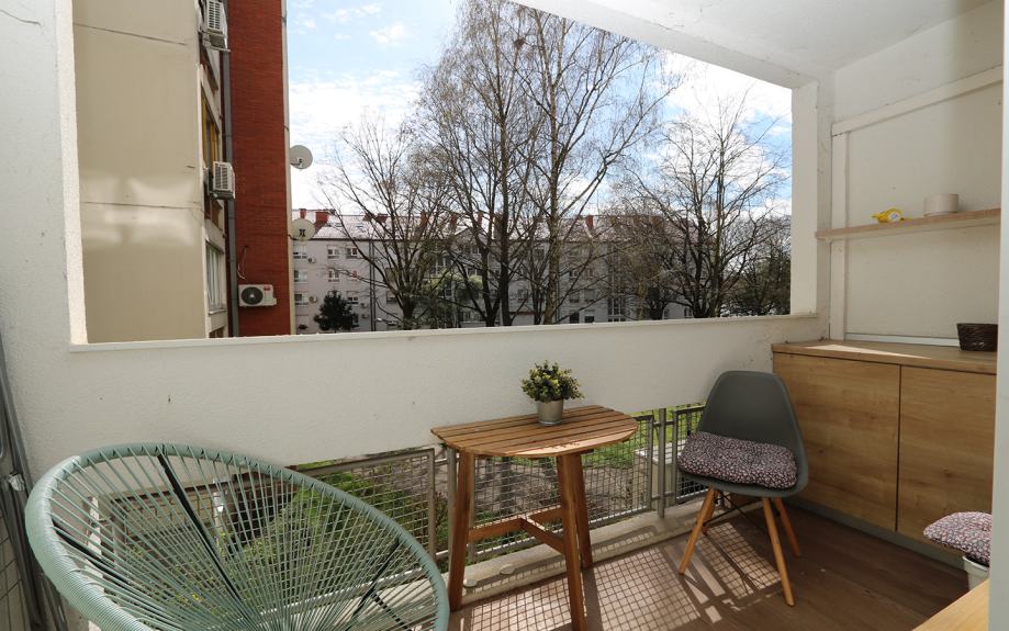Iznajmljuje se trosobni stan na prvom katu u mirnoj i dobro povezanoj četvrti Trešnjevka Jug, u Horvaćanskoj ulici. Stan ima površinu od 80 m² i sastoji se od dvije spavaće sobe, dvije kupaonice, kompletno opremljene kuhinje sa svim kućanskim aparatima, blagovaonice i prostranog dnevnog boravka i balkona s prekrasnim pogledom na park. Kompletno je namješten i opremljen, a renoviran je 2018. godine.