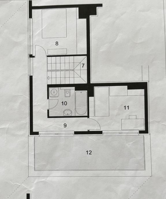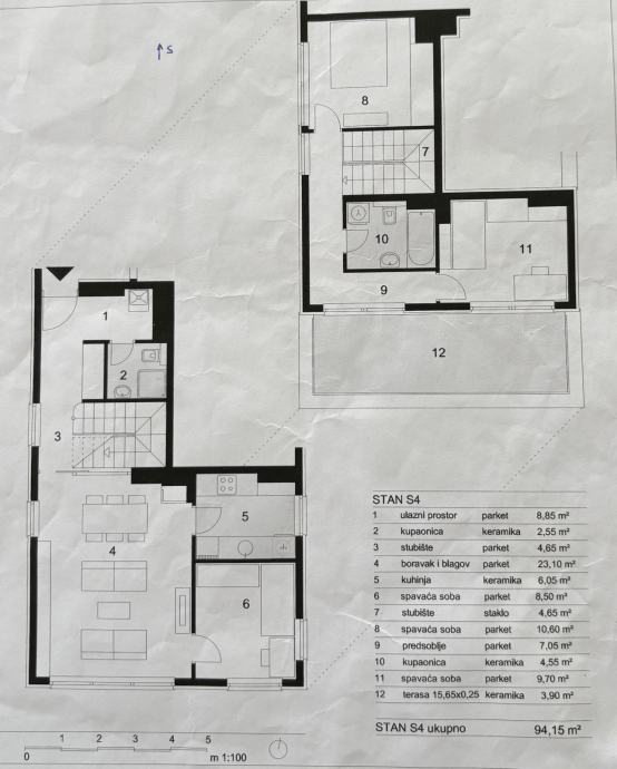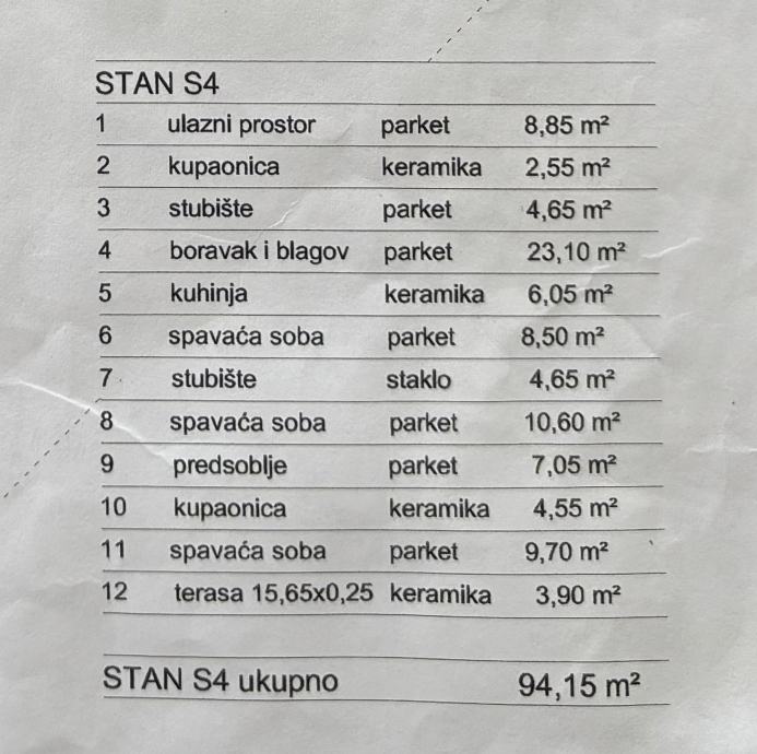 PRODAJE SE: četverosobni dvoetažni stan na prvom katu i potkrovlju objekta, a koji se sastoji od ulaznog dijela, kupaonice, hodnika sa stubištem, dnevnog boravka sa blagavaonicom, kuhinje i sobe, površine 54,52 čm, a u potkrovlju od stubišta sa hodnikom, dvije sobe i kupaonice, površine 36,00 čm, s terasom površine 16,07 čm kojem pripada parkirno mjesto dvorištu objekta, površine 12,50 čm i vrt u dvorištu objekta, površine 40,00 čm