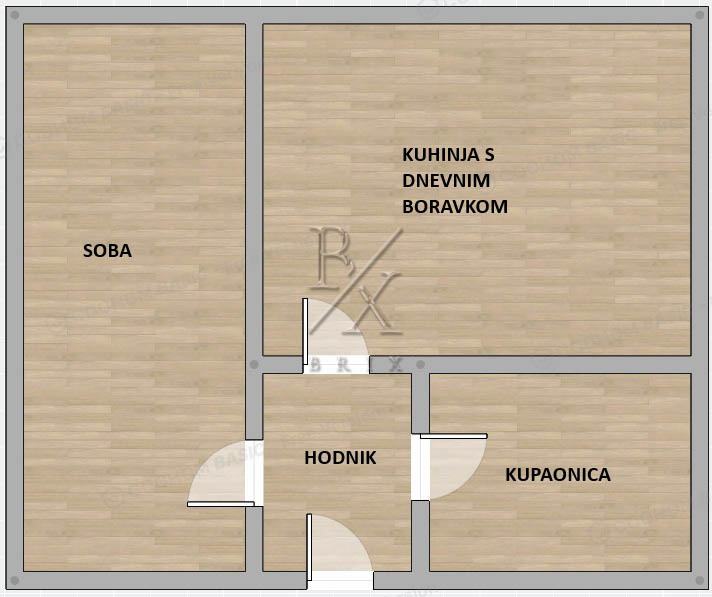 Stan se sastoji od ulaznog hodnika, spavaće sobe, kuhinje s dnevnim boravkom i blagovaonicom te kupaonice.