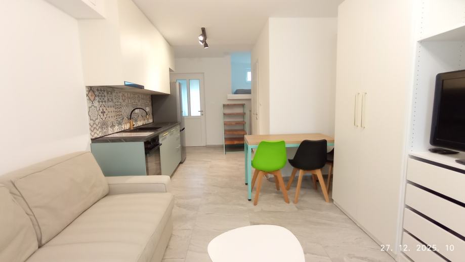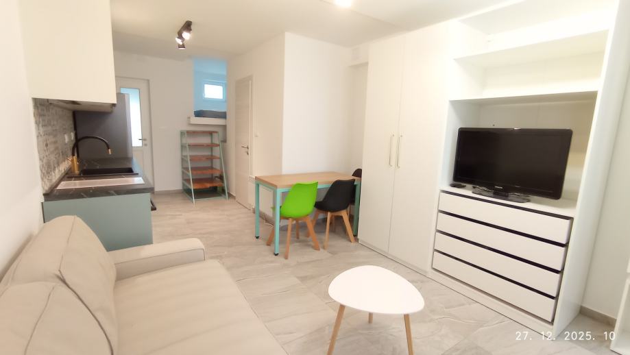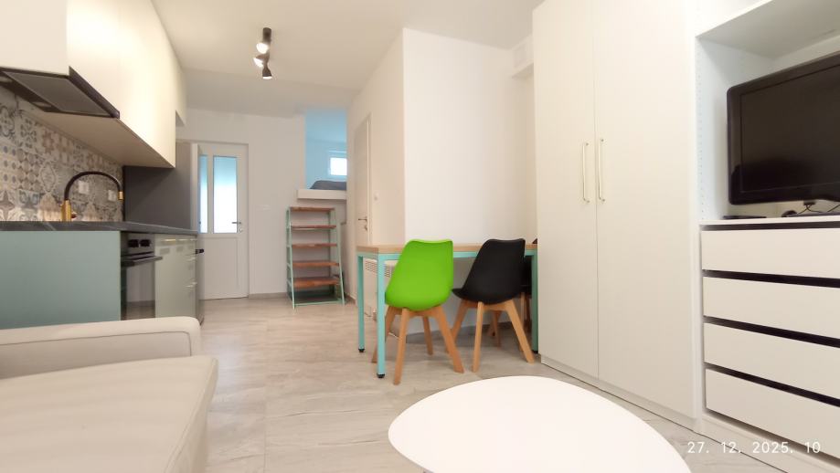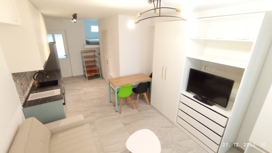 Stan je koncipiran kao "open space", unutar kojeg je dnevna soba sa kaučem na razvlačenje (razvučen 160cm×200cm) i veliki ormar te kuhinja s blagovaonicom.